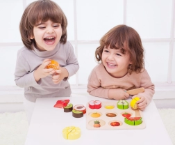 A gyerekek javítják motorikus képességeiket, miközben fából készült késsel vágják és rakják össze a gyümölcsöket.