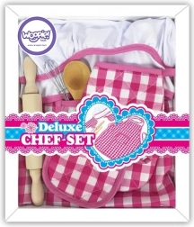 Rózsaszín-fehér kockás kötény és sapka, amelyek biztosítják a stílusos és funkcionális játékmenetet a gyerekek számára.