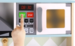 Ez a gyönyörű fa konyha számos funkcióval rendelkezik, mint például tűzhely, sütő, mikrohullámú sütő és üzenőfal, amelyre a gyerekek rajzolhatnak. A konyha kiváló minőségű anyagokból készült, és 3 éves korú gyerekek számára ajánlott.