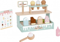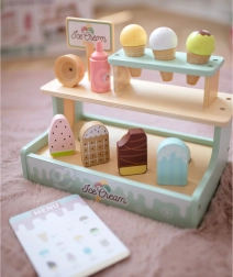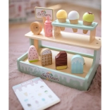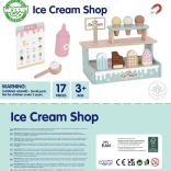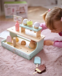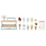Kétszintes állvány, tölcsérek, pálcikás fagyik, fagylaltadagoló és menü a valósághű kiszolgáláshoz, amelyek fejlesztik a szociális készségeket.
