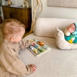Strapabíró fa tábla, sima élek és nem mérgező festékek. A vastag, markolható elemek könnyen megfoghatók, támogatva a finommotorikát és a kéz–szem koordinációt.