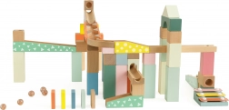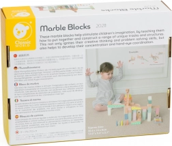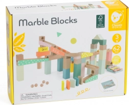 A Classic World márka fa golyópálya építő szettje 3 éves kortól alkalmas gyerekek számára. Ez a játék 62 különféle alakú és nagy blokkot tartalmaz, amelyek végtelen lehetőségeket kínálnak a kreatív pályaépítéshez. A pasztellszínű festékek és nem toxikus bevonatok biztosítják a játék biztonságosságát és esztétikus megjelenését.