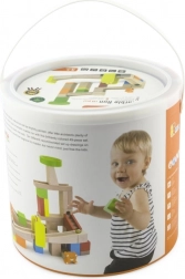 A csomag része egy praktikus, füles vödör a kényelmes tároláshoz és szállításhoz. Az elemek minőségi, lakkozott fából készülnek, élénk színekkel, mérgező anyagoktól mentes festékekkel. A játék fejleszti a finommotorikát, a térbeli képzelőerőt, a logikus gondolkodást és támogatja a kreativitást.