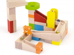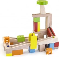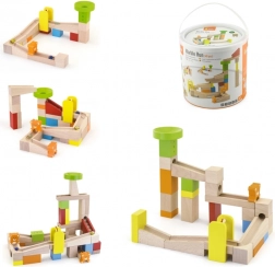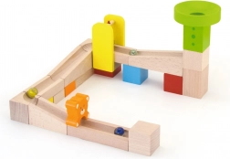 Építsd meg saját kalandos golyópályádat 49 masszív fa elemből, és figyeld, ahogy az üveg golyók száguldanak a síneken és rámpákon. A szett kínál kreatív építkezést, az ok-okozati összefüggések megismerését és a finommotorika fejlesztését. A praktikus füles vödör megkönnyíti a tárolást és a hordozást. A színes, sima elemek biztonságos, lakkozott fából készülnek, a játékos részletek (lépcsők, macik) pedig minden gyermeket elbűvölnek.