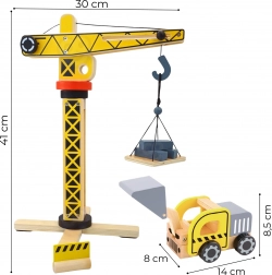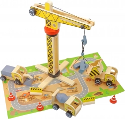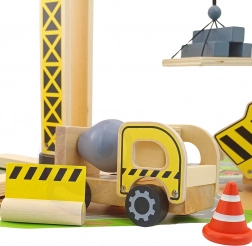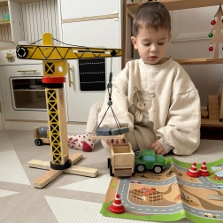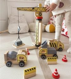 A WOOPIE GREEN által készített kiterjesztett építőkészlet kis építők számára készült. Ez a készlet nagy fa darut, három építőjárművet és további kiegészítőket tartalmaz a realisztikus építőjátékokhoz.