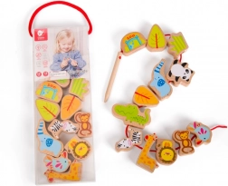 A fa gyöngyök felfűzése a tűvel ellátott zsinórra segíti a pontos fogást, a kéz–szem koordinációt és a türelmet – ideális gyakorlás a kis ujjaknak.