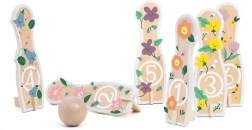 Kedvelt gyerekjáték bowling stílusban, szép, természetes kivitelben. A bábuk minőségi fából készülnek, vidám virágokkal és számokkal díszítve, így a gyerekek játékosan gyakorolják a számolást és a vizuális észlelést. A kompakt szett a mellékelt zsákban könnyen hordozható – ideális otthonra és útra.