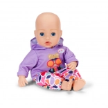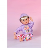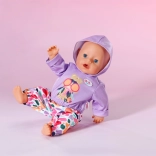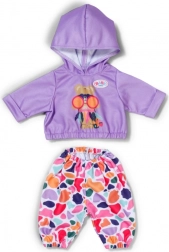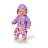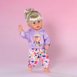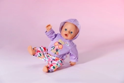 Stílusos szett 43 cm-es babákhoz: a lila, kapucnis pulóver vidám mintával harmonizál a színes nadrággal a játékos kombináláshoz. A csomag része egy újrahasznosított anyagból készült vállfa is. Az öltözet támogatja a kreatív játékot, könnyen feladható, és remekül illik a BABY born Teddy-re is.