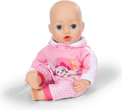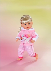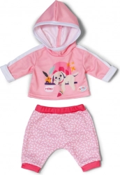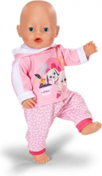 Ez a rózsaszín melegítő szett tökéletes kiegészítő a BABY born 43 cm-es babák és a BABY born Teddy ruhatárához. A pihentető kutyust ábrázoló, aranyos mintájú pulóver és a kellemes tapintású, finom mintás nadrág kényelmet biztosít minden kaland során. Átgondolt szabásának köszönhetően a ruha könnyen fel- és levehető.