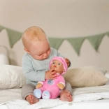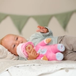Aranyos alvós plüss pajtás a legkisebbeknek: 30 cm-es, puha plüss baba csörgővel, rózsaszín rugdalózóval és sapkával. Ideális az első játékhoz, megnyugtatáshoz és a finommotorika fejlesztéséhez. Pihe-puha test, beépített csörgő, nagyon könnyű és könnyen megfogható, kézzel mosható, és születéstől alkalmas.