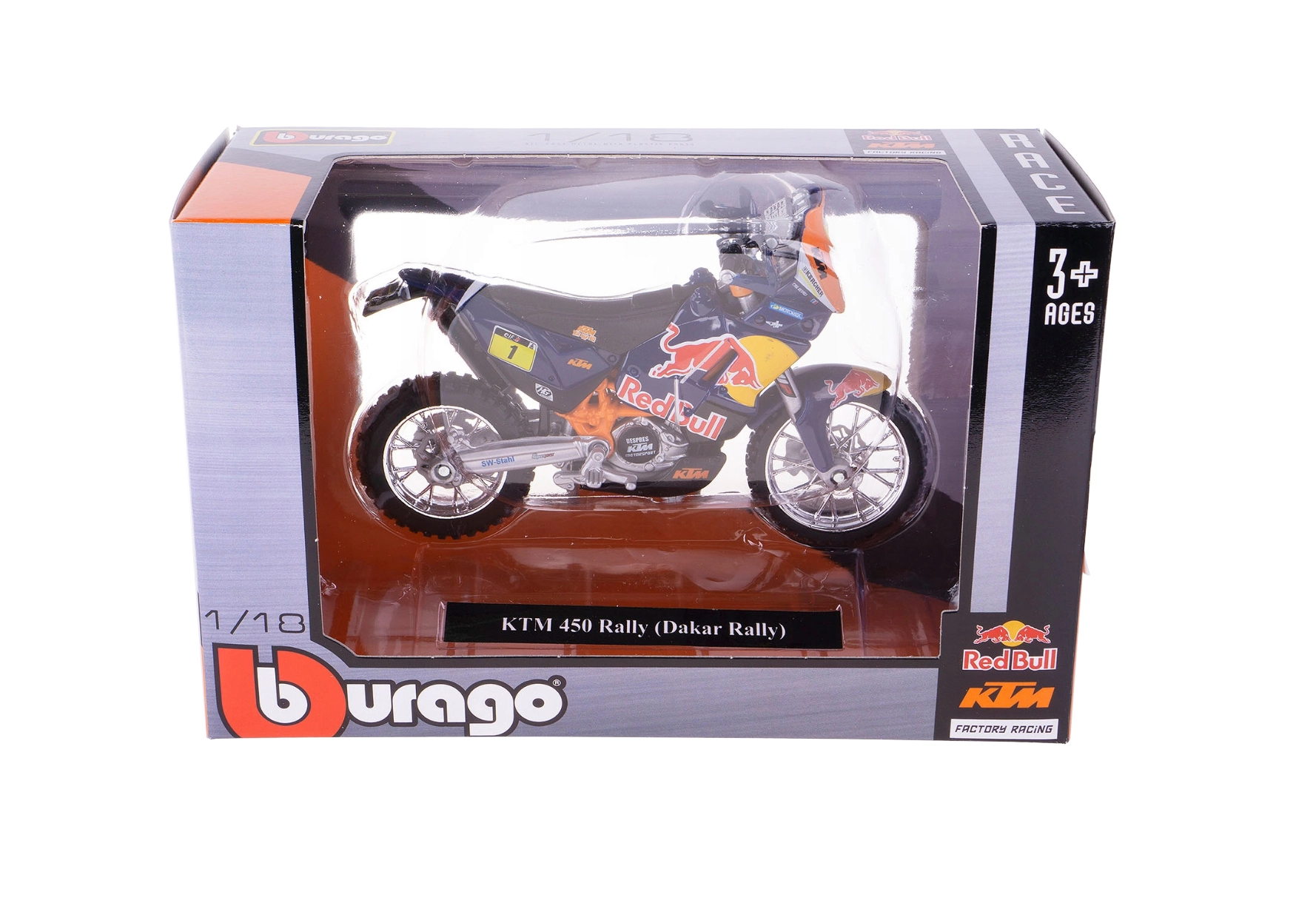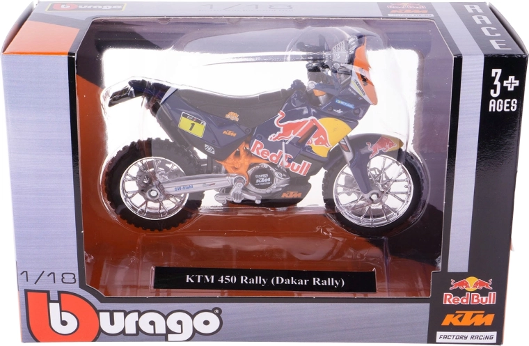 Részletesen kidolgozott Red Bull KTM 450 Rally motorkerékpár-modell 1:18 méretarányban a Bburago márkától. Fém kivitel műanyag kiegészítőkkel, élethű részletekkel, ideális gyűjtőknek és kis versenyzőknek 3 éves kortól.
