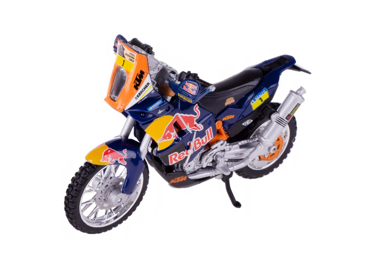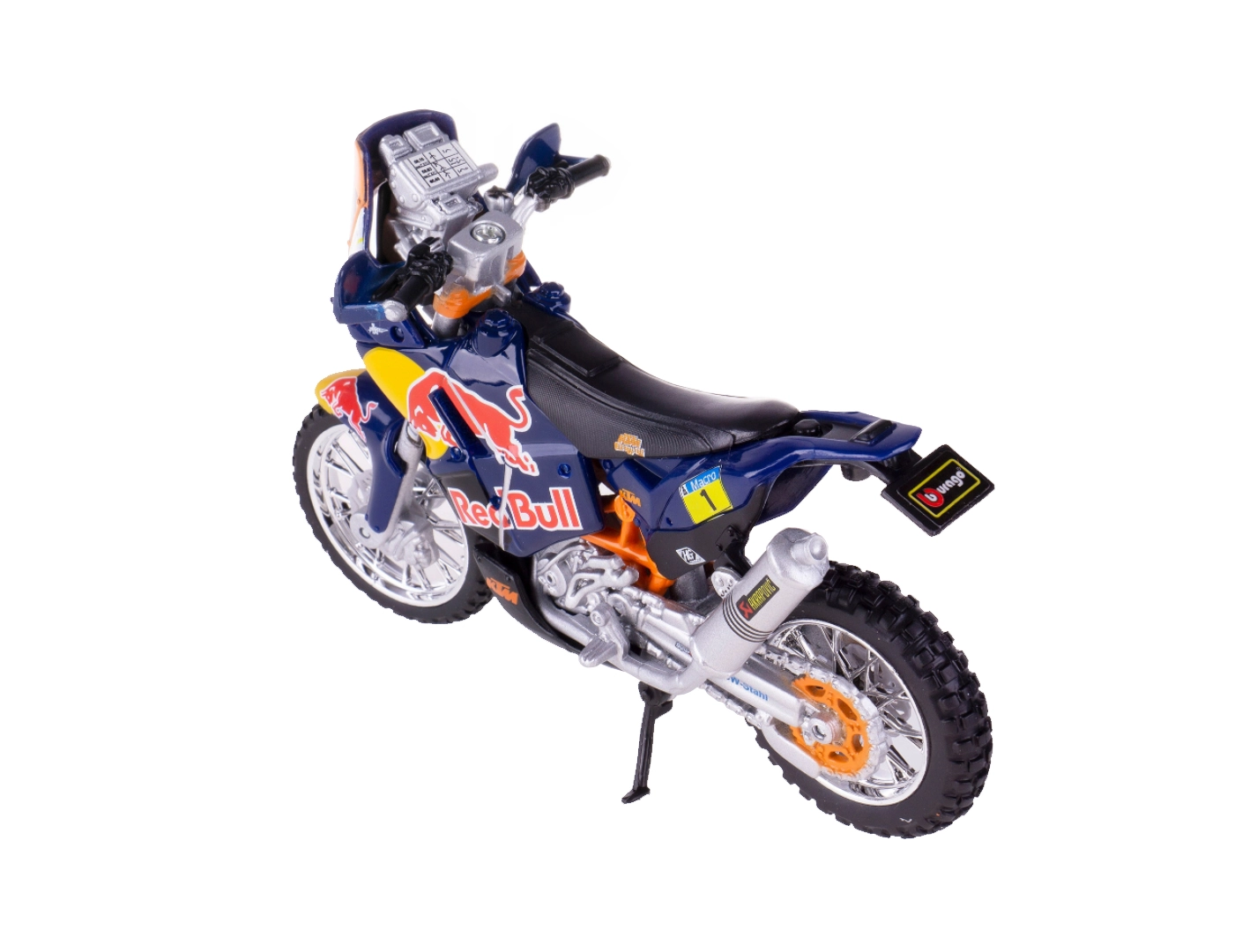 Fedezze fel a Red Bull KTM Factory Racing versenygépének precíz replikáját a legendás Dakar Rally-hoz. A Bburago 1:18 méretarányú modellje minőségi fém vázzal, finoman kidolgozott műanyag részletekkel és a csapat autentikus színvilágával és grafikáival nyűgöz le.