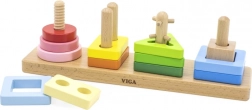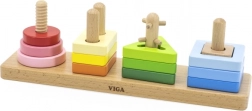 A fa geometriai osztályozó a Viga márkától egy oktató játék, amely a számolás és a formák és színek megkülönböztetésének tanulására szolgál. A négy alaprúdból mindegyikre a megfelelő alakzatokat kell felhelyezni. A szórakozás, amely első pillantásra egyszerűnek tűnik, nehezített, mert a kockákat a megfelelő kivágásokhoz kell igazítani. Játék közben a gyermek fejleszti a finommotorikát, a kéz–szem koordinációt és a logikus gondolkodást. Az élénk színek felkeltik a gyermek figyelmét és stimulálják érzékeit. Az osztályozó élei le vannak kerekítve, a nem mérgező festékek használata pedig biztonságot nyújt a gyermekek és a környezet számára.