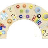 Ez a minőségi, félkör alakú falitábla színes felfedezővilágot hoz a gyerekeknek: fogaskerekek, labirintus, gyöngyspirál, formabedobó elemek, zenei részek (cintányérok, gong), tükrök, „időjárás” és „évszakok”, pörgethető tárcsa és hőmérő. A falra rögzített, masszív kivitel helytakarékos, és támogatja a kéz–szem koordinációt, a színek és formák felismerését, valamint a logikus gondolkodást.