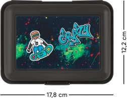 Bemutatjuk az egyedülálló műanyag lunchboxot modern és figyelemfelkeltő dizájnnal. Ez a fekete doboz graffiti stílusban ideális mindennapi használatra iskola vagy munkahely céljából. Grafikailag érdekes fedele különösen vonzó lesz a gördeszkázás és az aktív életmód szerelmeseinek.
