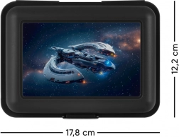 Űrhajó mintás uzsonnás doboz az űr szerelmeseinek. Ez a fekete doboz nem csak stílusos, hanem praktikus is: