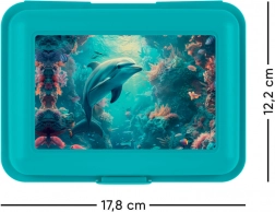 Az uzsonnás dobozt vidám és színes delfin és korallzátony mintával díszítették, amely minden korosztály számára vonzó.