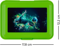 Élvezze a kényelmet és stílust ezzel a műanyag ebéd dobozzal, amelyet dinamikus focista motívum díszít. Maximális funkcionalitásra és esztétikára tervezték: