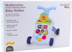 A levehető panel kormánnyal kis versennyé varázsolja a játékot – gombok, forgatható tárcsák és színes fényecskék gondoskodnak a szórakozásról és az érzékszervi stimulációról. A járássegítő ideális ajándék kb. 9 hónapos kortól.