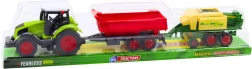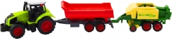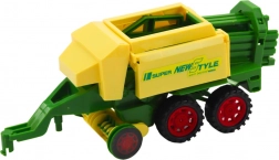 A traktor, a pótkocsi és a prés teljes szettet alkot, amellyel a gyerekek könnyedén utánozhatják a mezei munkát – a begyűjtéstől a szénabálák szállításáig.