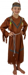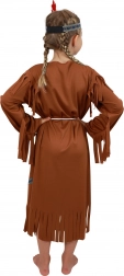 A lány jelmez kényelmet és látványt egyaránt kínál: a barna ruhát kontrasztos szegélyek és gazdag rojtok díszítik, amelyek minden lépésnél szépen hullámoznak. A kellemes tapintású textilanyag és a lazább szabás támogatja a szabad mozgást, így gyermeke korlátok nélkül élvezheti a játékot. Az összeillő tollas fejpánt teljessé teszi az összképet, a zsinór pedig egyszerű övként szolgál.