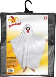 Aranyos és ijesztő gyerek szellemkosztüm 3–7 éveseknek, egyszerű jelmez Halloweenre, farsangra és iskolai rendezvényekre. Könnyű anyagból, kényelmes szabással és szemnyílásokkal a biztonságos kilátásért. Univerzális fehér köpeny arcnyomattal és kb. 106 cm hosszúsággal a fejtől mérve, fiúknak és lányoknak egyaránt.