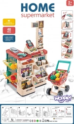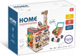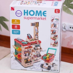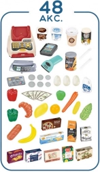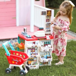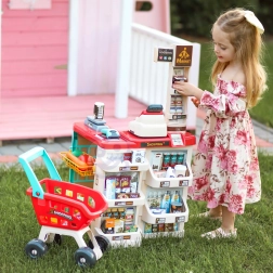 A csomag része egy stabil kocsi és 48 kiegészítő: gyümölcs, zöldség, italok, tejtermékek, papírpénz és bankkártya – minden, ami a teljes bevásárláshoz kell.