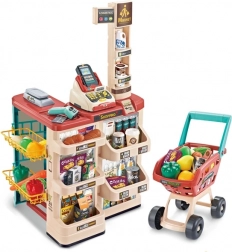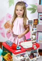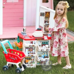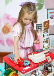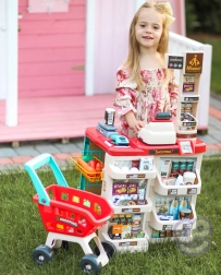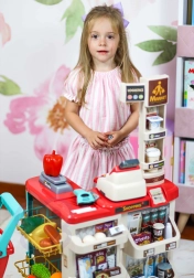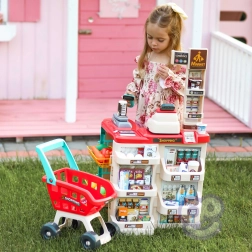 Az átgondolt elrendezés polcokkal és árcédulákkal segít a pénz értékének megértésében, a számolásban és az alap pénzügyi ismeretekben. A valósághű élelmiszerek (gyümölcs, zöldség, italok, tejtermékek stb.) serkentik a képzeletet és a beszélgetést, míg a tartós műanyag kivitel bármely gyerekszobába illik.