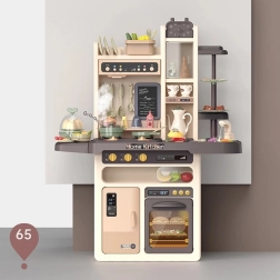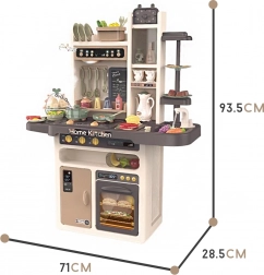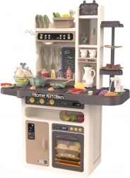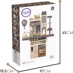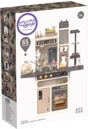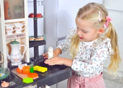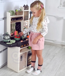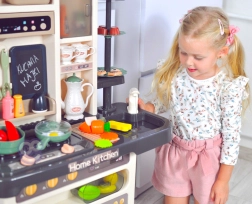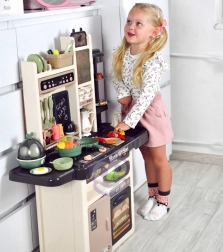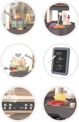 A készlethez tartozik még tojásfőző LED-fénnyel és hanggal, nyitható sütő és hűtő, krétás tábla a napi menühöz, edényszárító és többféle tárolóelem. A gazdag, 65 darabos kiegészítő csomag tépőzáras gyümölcsöket és zöldségeket, edényeket, evőeszközöket és teaszettet is tartalmaz, így a gyerekeknek mindenük megvan a kreatív játékhoz.