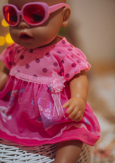 A ruhácskán kívül a csomagban megtalálhatók a hozzá illő cipőcskék és a rózsaszín szemüveg is – minden készen áll az azonnali játékra és öltöztetésre.