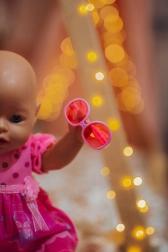 A ruhácskán kívül a csomagban megtalálhatók a hozzá illő cipőcskék és a rózsaszín szemüveg is – minden készen áll az azonnali játékra és öltöztetésre.
