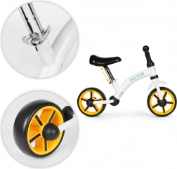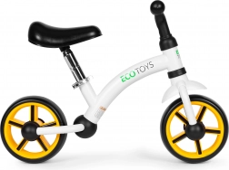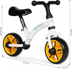 A könnyű ECOTOYS futóbicikli 3 éves kortól segít fejleszteni az egyensúlyt és a koordinációt. Erős, porszórt bevonatú acél vázzal, állítható, 33–41 cm-es üléssel, karbantartásmentes EVA kerekekkel és kormányütközővel a nagyobb biztonságért. Beltérre és kültérre egyaránt alkalmas, 30 kg-ig terhelhető, az ergonomikus, habszivacs ülésnek köszönhetően pedig kényelmes a használata.