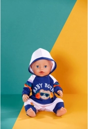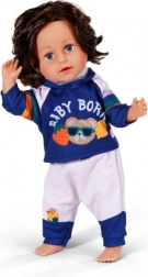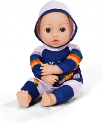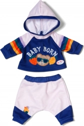 Stílusos melegítő szett 43 cm-es babákhoz, amely új dimenziót ad a játéknak. A szett egy kapucnis pulóvert és nadrágot tartalmaz kék–fehér kombinációban, játékos szivárványcsíkokkal és BABY BORN felirattal. A ruházat könnyen fel- és levehető, ideális a szerepjátékhoz, a finommotorika fejlesztéséhez és a gyermekek fantáziájának támogatásához 3 éves kortól.