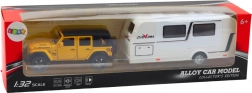 Élethű fém terepjáró modell lakókocsival 1:32 méretarányban, fém kivitelben, fény- és hangeffektekkel, felhúzható pull-back meghajtással és nyitható ajtókkal. Remek játékhoz és gyűjteménybe egyaránt, elemekkel együtt.