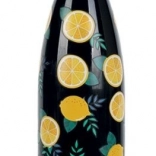 Fekete, fém termosz citrom- és levélmintákkal, amely első pillantásra elbűvöl.