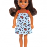 A baba kék, mintás ruhájával (szivárványok, szívecskék, finomságok), hosszú barna hajával rózsaszín fejpánttal és piros szandáljával hódít. Más Chelsea babákkal és kiegészítőkkel (külön kapható) kombinálva a móka még változatosabb.