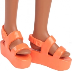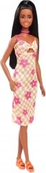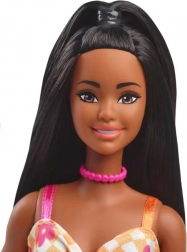 Gyönyörű, magas Barbie baba hosszú fekete, részben feltűzött hajjal, rózsaszín chokernyaklánccal és narancssárga platformszandálokkal. Megjelenését elegáns, virágmintás ruha teszi teljessé.