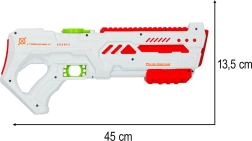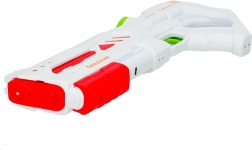 Ez a modern, fehér színű vízipisztoly zöld és piros részletekkel új stílusban hozza el a kedvelt szórakozást. A automatikus ravasznak és az USB-s töltésnek köszönhetően a gyerekek intuitívan és erőfeszítés nélkül kezelhetik. Az ergonomikus kialakítás és az alacsony tömeg kényelmes fogást biztosít hosszabb játék közben is.