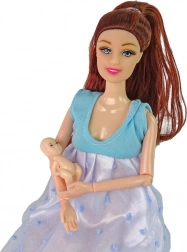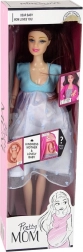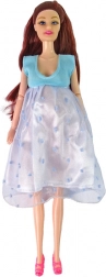 A babának hosszú barna haja van copfban, kék ruhát visel bővülő, pöttyös szoknyával és rózsaszín cipőcskékkel. Tökéletes ajándék azoknak a gyerekeknek, akik szeretik a babákat és szívesen alkotnak családi történeteket. A termék megfelel a CE és EN71 szabványoknak, így biztonságos 3 éves kortól.
