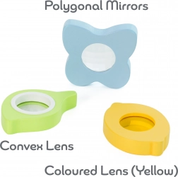 - Tartalmaz kaleidoszkópot és 3 különbözően kialakított lencsét, amelyek megváltoztatják a környező világ színét, alakját és méretét
