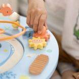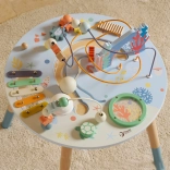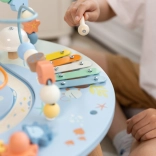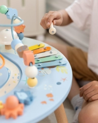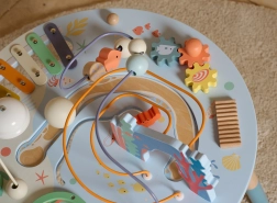 Az asztal xilofont, csengőket és más zenei elemeket tartalmaz, amelyek felkeltik az érdeklődést a zene és ritmus iránt.