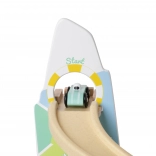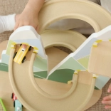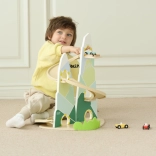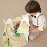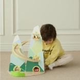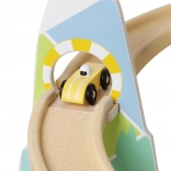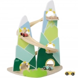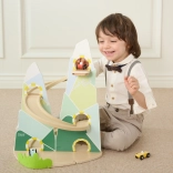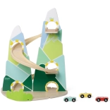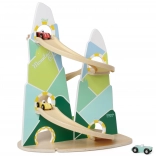 Ez az eredeti, két csúcsot formázó hegyi versenypálya minőségi fából készült, és nem mérgező festékekkel lakkozott, kellemes pasztell árnyalatokban. A 18 hónapos kortól ajánlott játék során a gyerekek a 3 mellékelt kisautót indíthatják el a kanyargós pályákon, figyelhetik a haladást, tanulhatják a színeket és fejleszthetik a megfigyelőképességet.