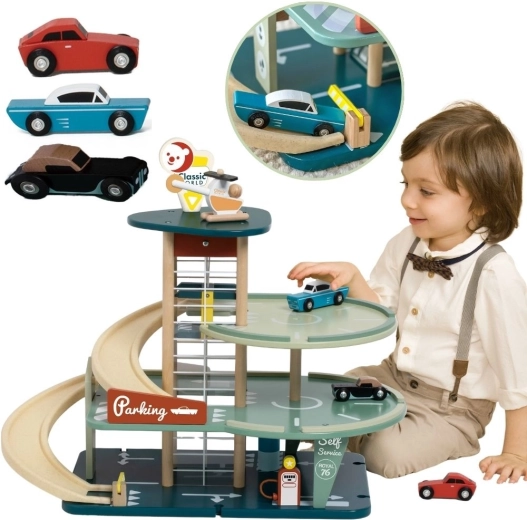 Az 50-es évek ihlette, stílusos CLASSIC WORLD fa parkoló három szintnyi játékélményt nyújt felvonóplatformmal, bioplasztik spirálrámpával, kisautókkal, autómosóval, benzinkúttal és helipaddal. A FSC tanúsítvánnyal rendelkező minőségi anyagok támogatják a finommotorikát, a képzeletet és a szociális készségeket 3 éves kortól.