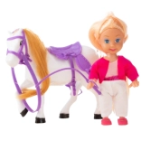 A csomag tartalma: mini baba lovas öltözetben, fehér ló hosszú sörénnyel és farokkal, lila nyereg és kantár, lovaglópálca.