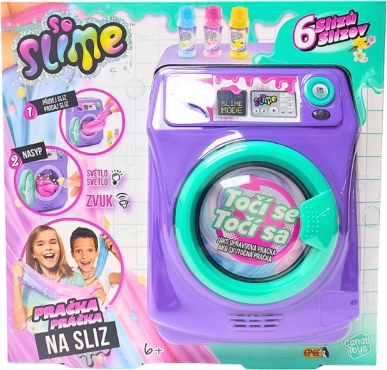 Fedezd fel a slime-készítés szórakoztató világát a SO SLIME illatos slime mosógéppel lila–türkiz színben. A 6 éves kortól ajánlott játék fény- és hangeffektekkel, forgódobbal és átlátszó ajtóval teszi látványossá a keverést. A csomagban 6 slime tasak, egy kosár, egy palack és 3 illatos gyöngy vár, hogy varázslatosan illatos, színes slime-ot készíthess. Tápellátás: 3× AA (nem tartozék).
