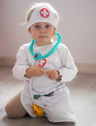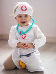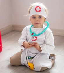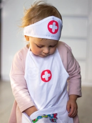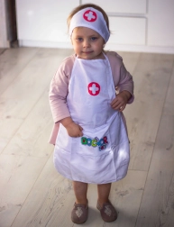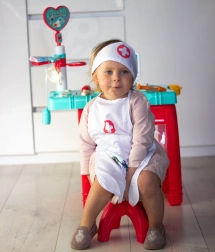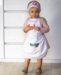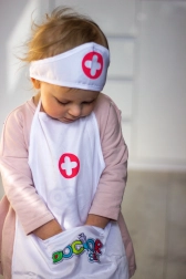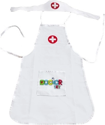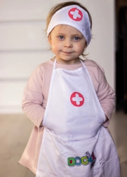 Könnyű kötény praktikus zsebekkel, amelyben elfér a sztetoszkóp és más gyerek kellékek, hogy az orvosos játék mindig kéznél legyen.