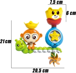 Ez az interaktív WOOPIE fürdőjáték minden fürdést vidám élménnyé varázsol. Amikor vizet öntesz a majom sapkájába, elindul a mókás kaszkád – a szemek forognak, a száj kinyílik, és a víz közvetlenül a kádba folyik. A kacsintó arckifejezésű hernyó és a csillag a vízsugarat egy forgó kerékre irányítja, amely keveri a vizet és további látványos hatást ad.