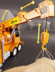A fő attrakció a mozgatható darukar, amelynek magassága és hossza állítható, valamint a plató forgatása a horoggal ellátott zsinór fel- és lecsévéléséhez. A 1:14 méretarányú, valósághű arányok és a részletgazdag kidolgozás támogatják a finommotorika, a képzelet és a szerepjáték fejlődését építkezés és rakomány emelése közben.