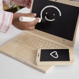 Engedje, hogy a gyerekek a maguk módján fedezzék fel a felnőttek világát. Ez az átgondolt, fából készült „home office” készlet hiteles kiegészítőket kínál biztonságos és kellemes kivitelben. A „laptop” és a „mobil” krétatáblás kijelzővel végtelen írásra, rajzolásra és történetalkotásra hív – papírpazarlás nélkül. Az FSC minősítésű minőségi fa kellemes tapintású, és a mindennapos gyermeki fantáziának is ellenáll.