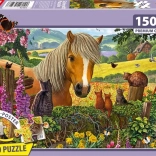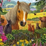 A Schmidt Spiele „Süßer Besuch auf der Pferdekoppel” kirakó remek választás 7 éves kortól az állatokat imádó gyerekeknek. 150 darabból áll, az elkészült kép mérete 43 x 29 cm, és lovakat ábrázol legelőn kiscicákkal.